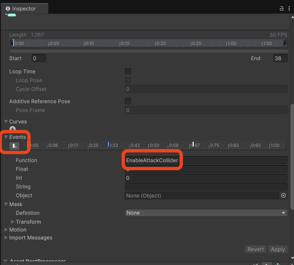EnableAttackCollider。 - 在攻擊結束的格數加 Animation Event,Function 填