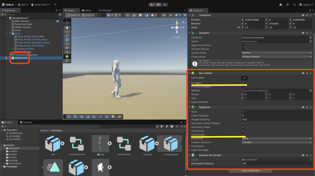 - 怪物必須有 Collider(Is Trigger)和 Rigidbody(isKinematic = true)。